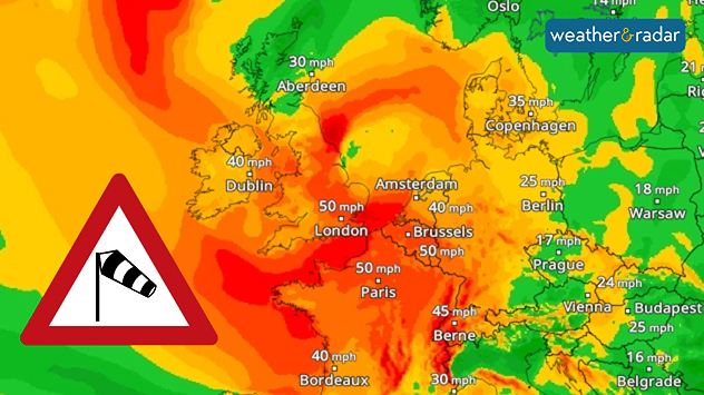 Forecast for Thursday: The red colours on the WindRadar indicate a large storm area across western Europe.