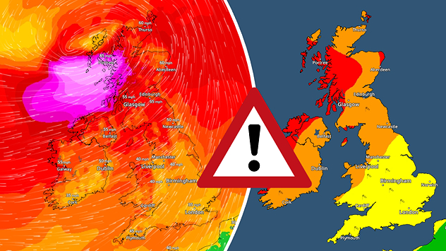 Split weather map showing the UK and Ireland. The left side illustrates strong winds circulating around a low-pressure system, with gusts of 20–30 mph highlighted in orange and yellow. The right side shows radar imagery with widespread blue rain bands and patches of thunderstorms, especially over northern England and Scotland.
