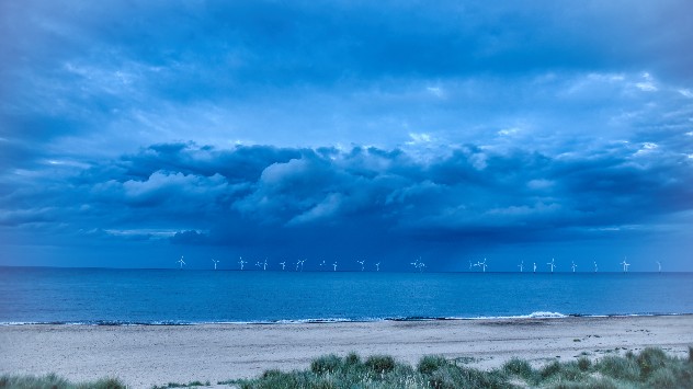 Temperature map showing maximum values at the beginning of next week and wind radar showing a storm system over the Atlantic that is directing mild air towards Europe
