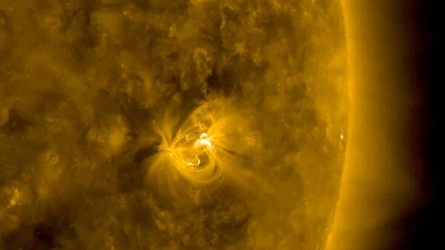 Split image showing a towering storm cloud with rain shafts over the sea on the left and a vivid red aurora illuminating the night sky above residential rooftops on the right, divided by a curved white line.