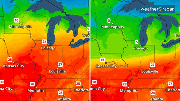 A sharp drop in temperatures is on the way in the US. Maximum temperatures for today (left) and tomorrow (right).