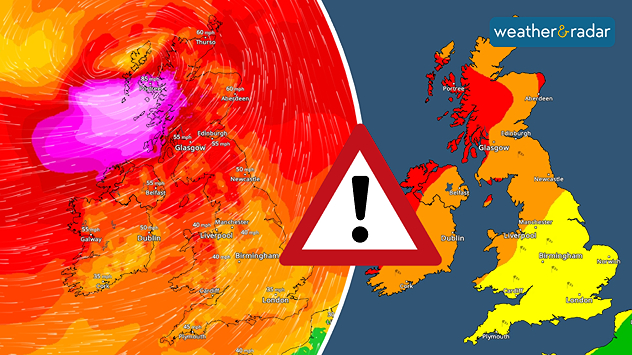 Split image shows high level wind warnings during Storm Éowyn on the left, and noctilucent clouds on the right.