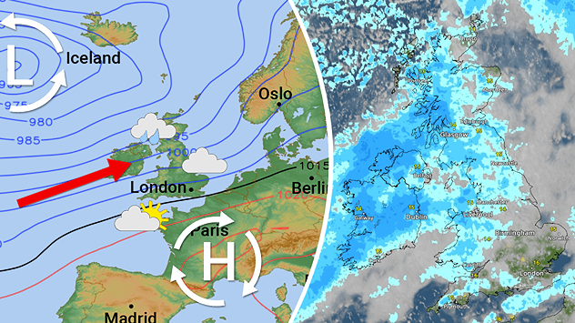 Split-screen weather map showing blue rain coverage over western UK and Ireland, and yellow to orange warning zones over England and Wales, with a rain hazard symbol in the centre.