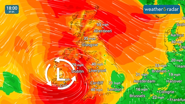 The system will bring severe gales with gusts of up to 75 mph in coastal areas of Ireland and Northern Ireland. Strong, blustery conditions also spread more widely.
