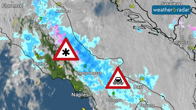 The WeatherRadar shows persistent rain over the north-eastern slopes of the mountains in central and southern Italy.