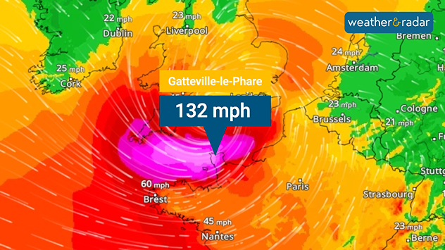 Wind gusts of up to 132 miles per hour were recorded on the English Channel coast at a lighthouse in Gatteville-le-Phare, France.