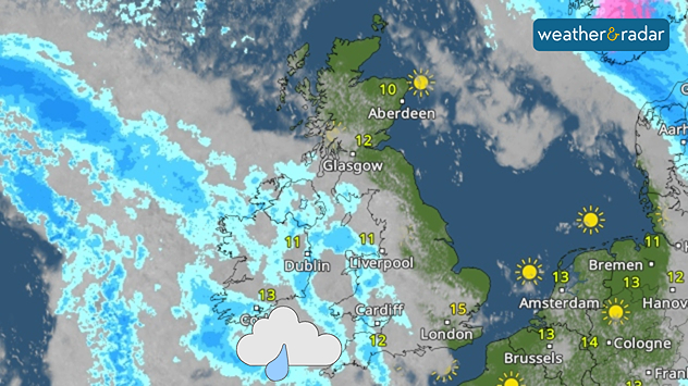 Wednesday stays rather cloudy for most. Spells of rain move through, turning heavier at times across Ireland and western parts of the UK.