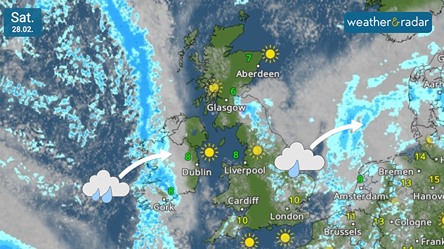 As showers depart the UK, heavier rain arrives in Ireland.