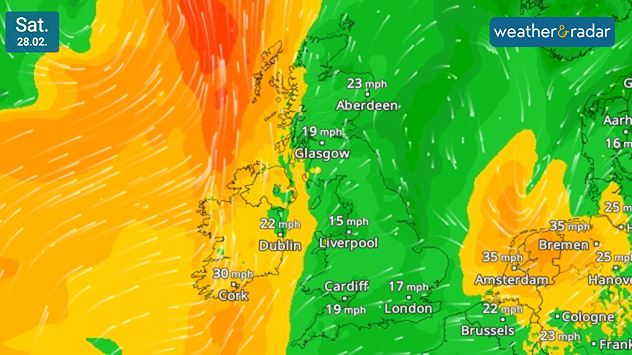 Strong gusting winds are expected, reaching up to around 50 mph around the south-west English and western Welsh coasts.