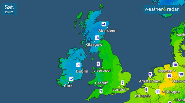 UK temperature map dated 14.02 showing widespread subzero values in blue shading, with readings such as −4 in Glasgow, −3 in Dublin, and −2 in London, alongside a blue thermometer icon.